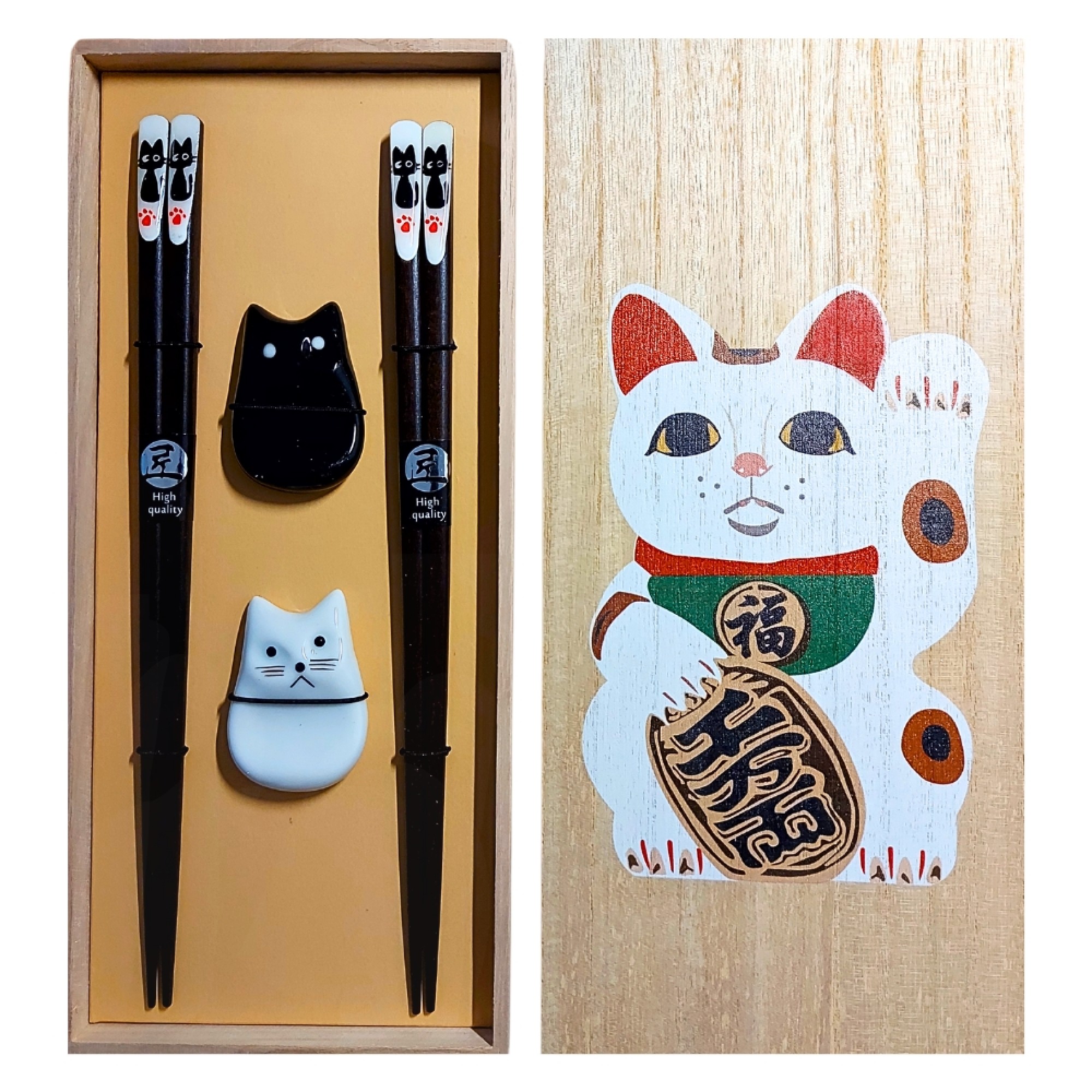 Σετ Τσόπστικς με Κεραμικό Μαξιλαράκι σε Σχήμα Γάτας, 2 ζεύγη JADE TEMPLE